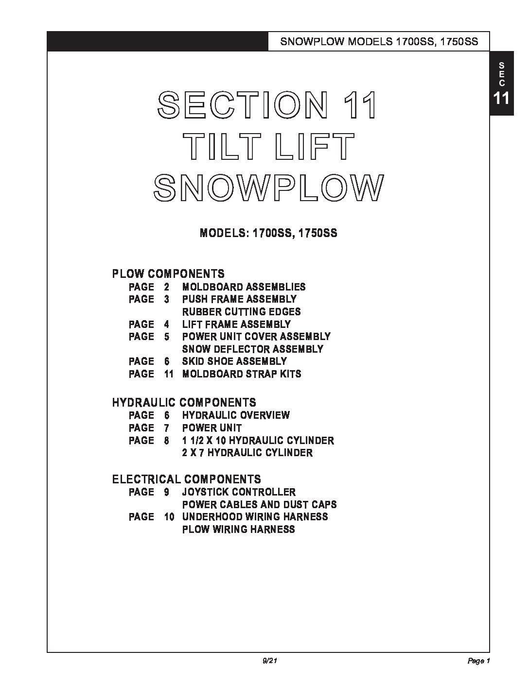Parts Diagram for Hiniker 1700SS, 1750SS Tilt Lift Plows. Parts Diagram #25013108 Revision J Section 11