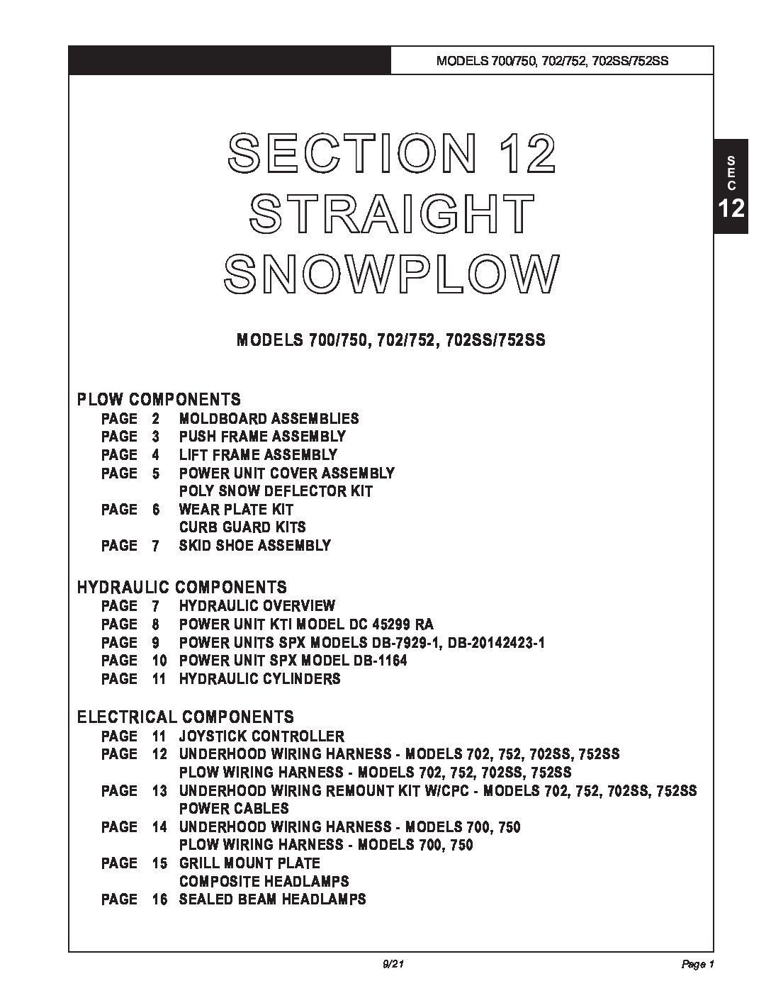 Parts Diagram for Hiniker 700, 750, 702, 752, 702SS, 752SS Straight Plows. Parts Diagram #25013108 Revision J Section 12