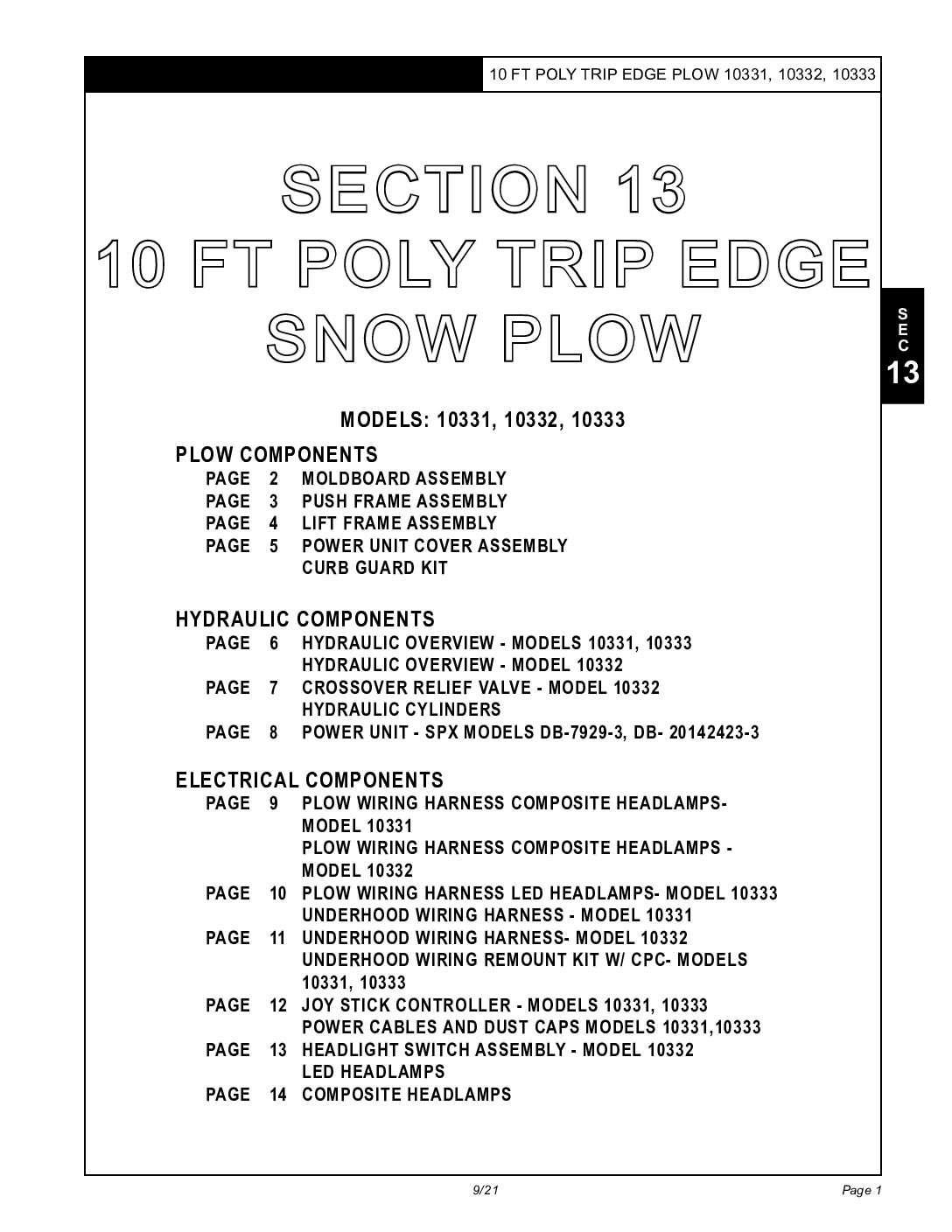Parts Diagram for Hiniker 10331, 10332, 10333 10′ Trip Edge Straight Plows. 25013108 Revision J Section 13
