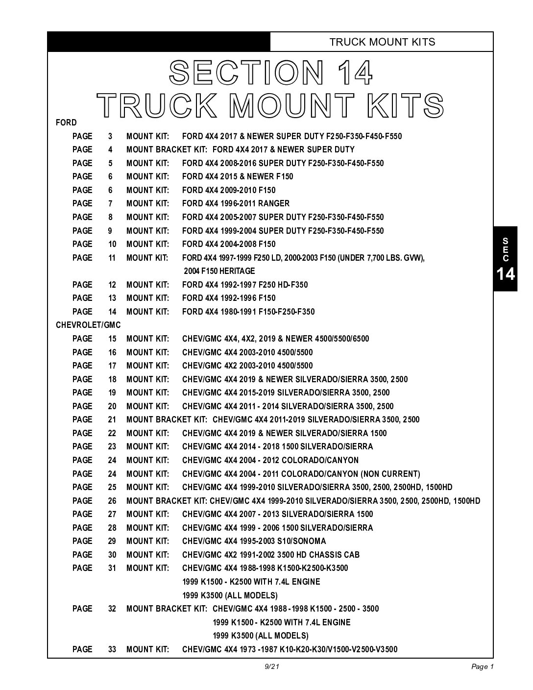This document is the full list of Hiniker plow mounts and applications for applicable makes and models of truck. Find out which plow fits your truck and which mount and headlight adapter you need. Parts Diagram #25013108 Revision J Section 14