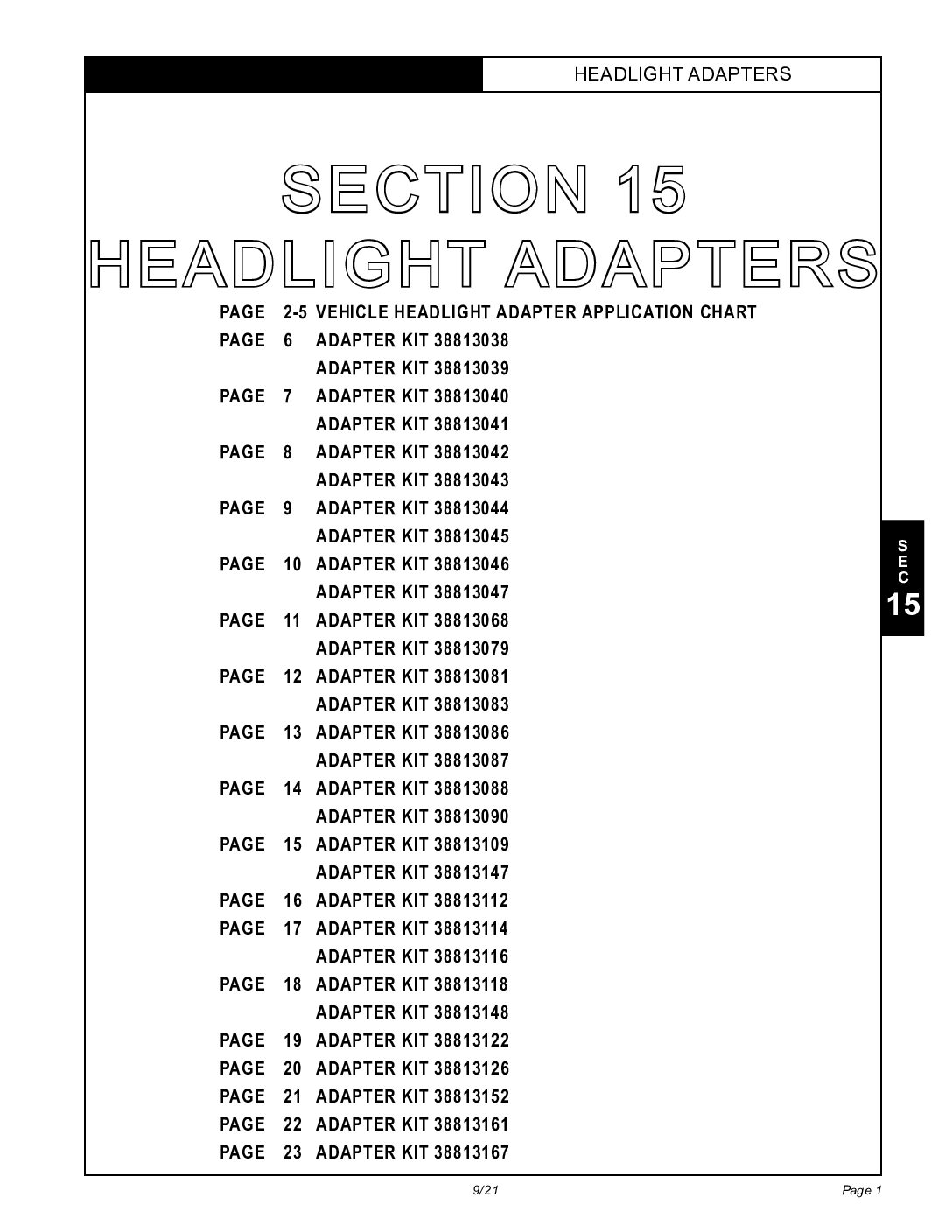 This diagram shows the full list of Hiniker headlight adapters and their applications. Parts Diagram #25013108 Revision J Section 15