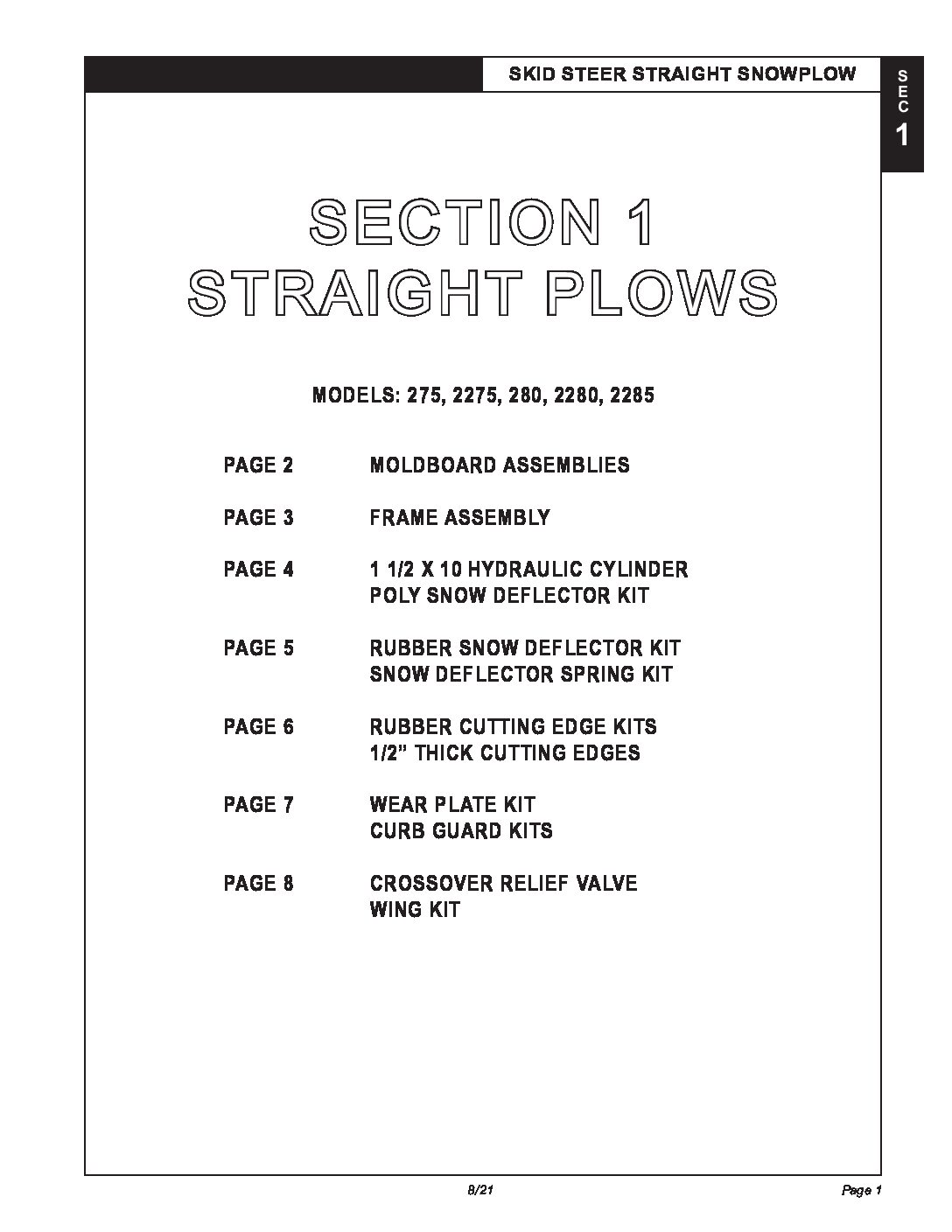 Parts Diagram for Hiniker 275, 280, 2275, 2280, 2285 Straight Plows. Parts Diagram #25013110 Revision J Section 1