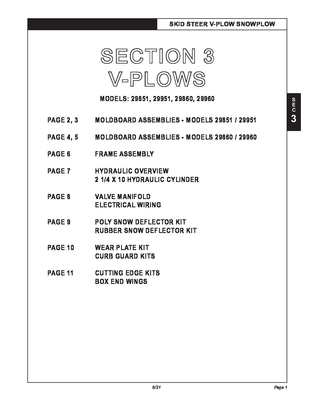 Parts Diagram for Hiniker 29851, 29951, 29860, 29960 V-Plows. Parts Diagram #25013110 Revision J Section 3