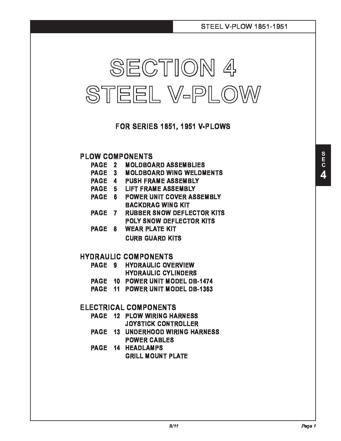 Parts Diagram for Hiniker 1851, 1951 V-Plows. Parts Diagram #25011899 Revision G Section 4