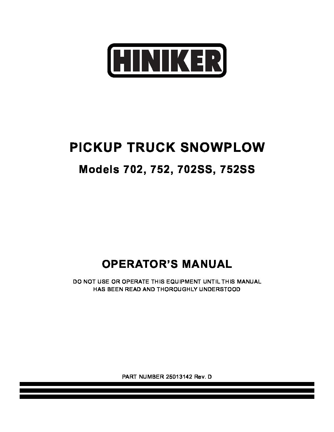 Operator’s Manual for Hiniker 702, 752, 702SS, 752SS straight blade snow plows. Manual #25013142 Revision D