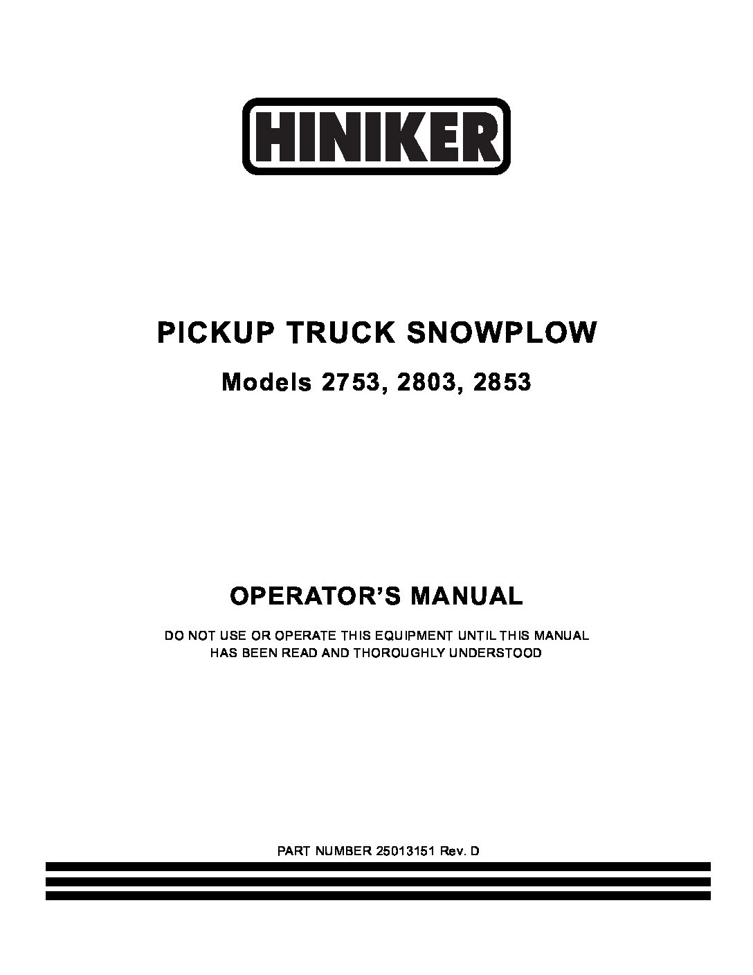 Operator’s Manual for Hiniker 2753, 2803, 2853 straight blade snow plows. Manual #25013151 Revision D