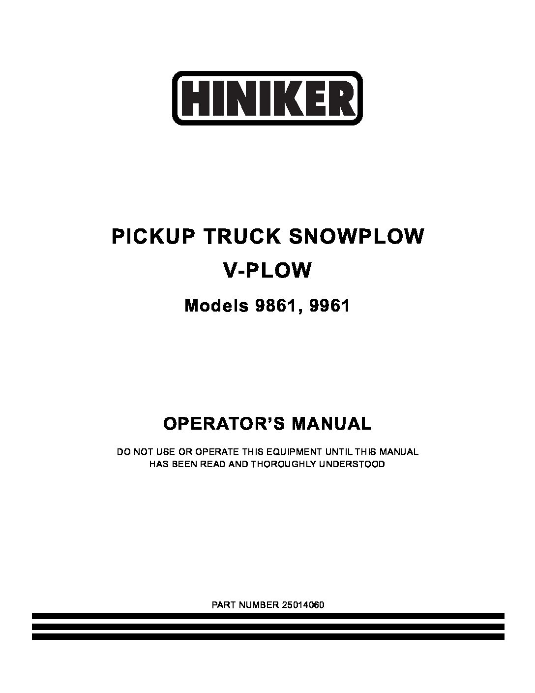 Operator’s Manual for Hiniker 9861, 9961: V-Plows. Manual #25014060