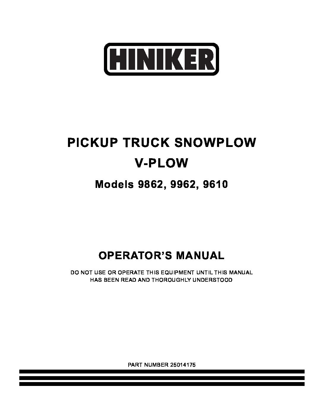 Operator’s Manual for Hiniker 9862, 9962, 9610 V-Plows. Manual #25014175